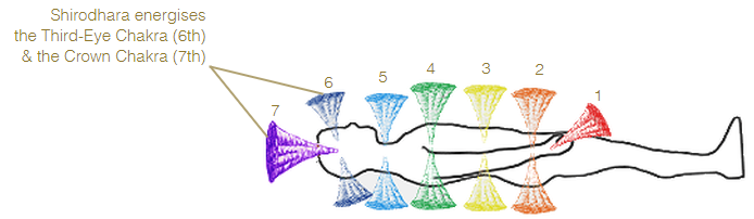 Shirodhara does massage & activation of Pineal Gland. Shirodhara works by stimulating the Third Eye Chakra and the Crown Chakra, which produce Autonomous Sensory Meridian Response (ASMR) which is a euphoric experience characterized by a static-like tingling sensation on the skin that typically begins on the scalp and moves down the back of the neck and upper spine, precipitating relaxation and brings balance and harmony in the body.